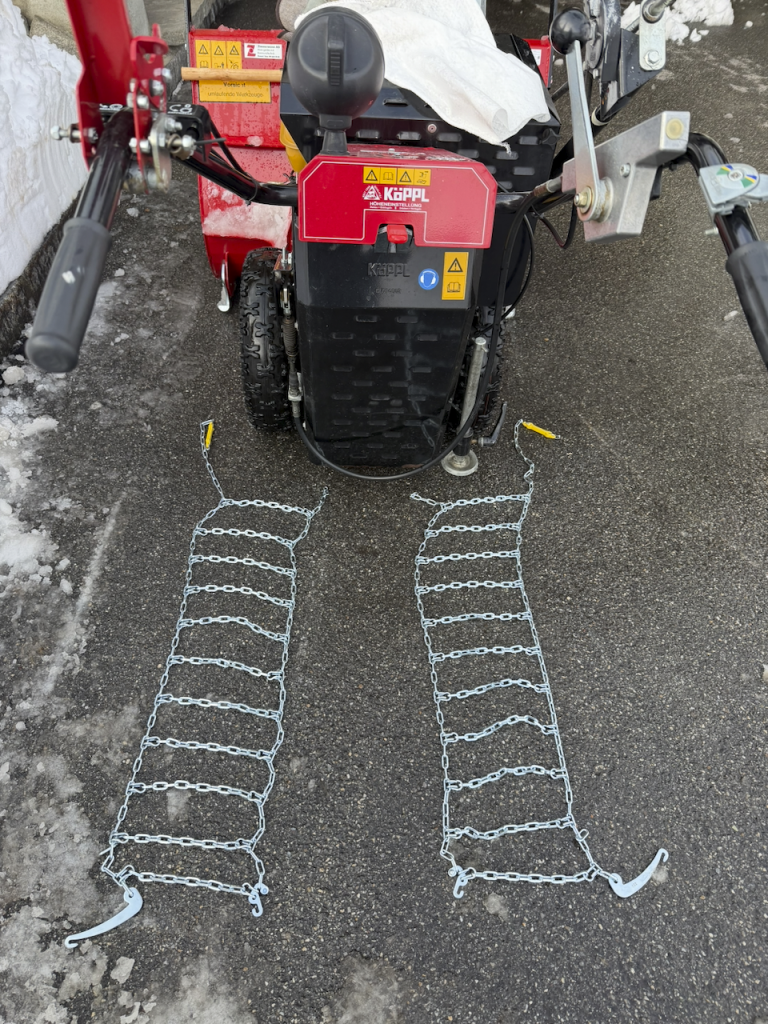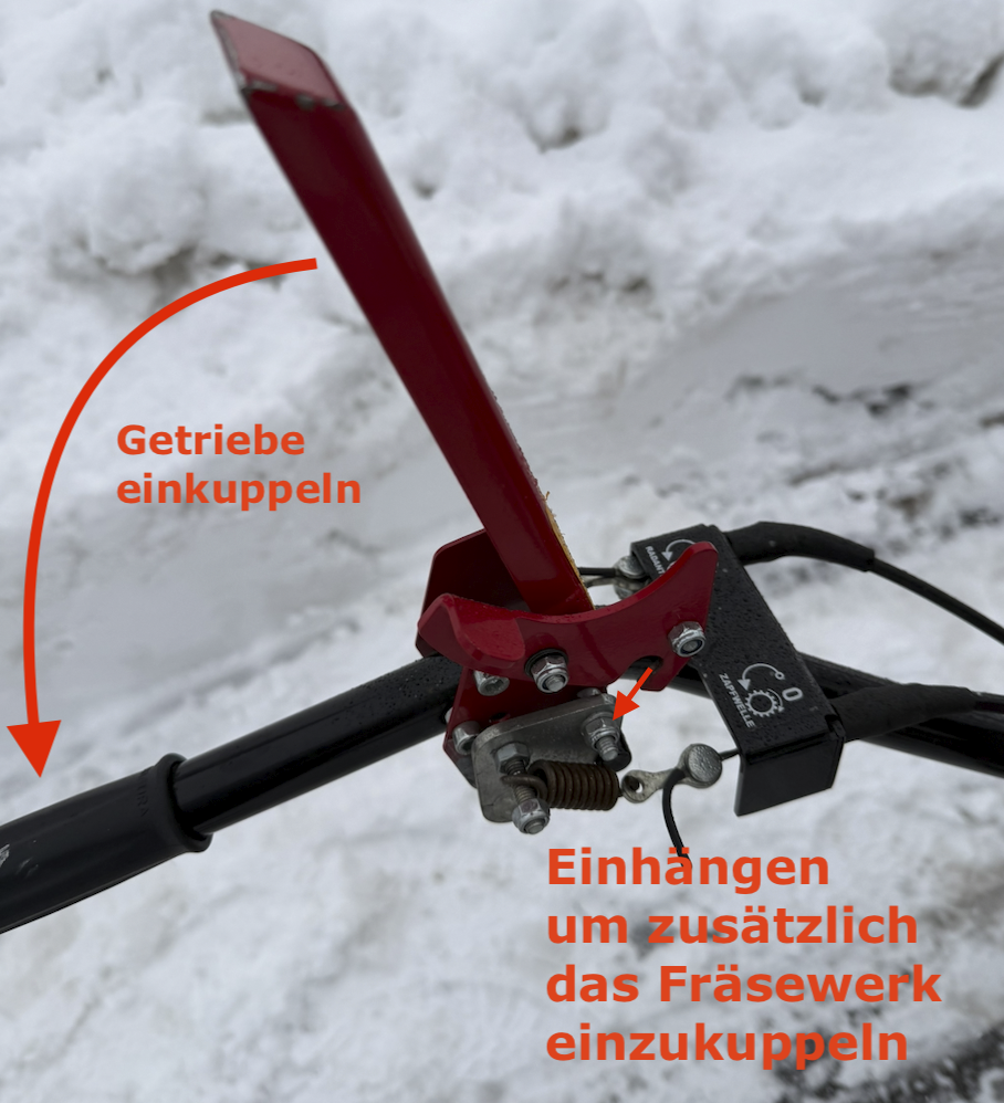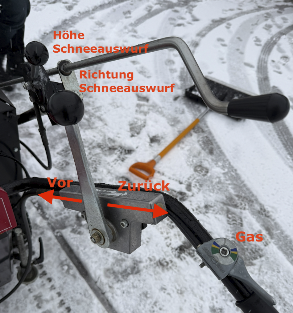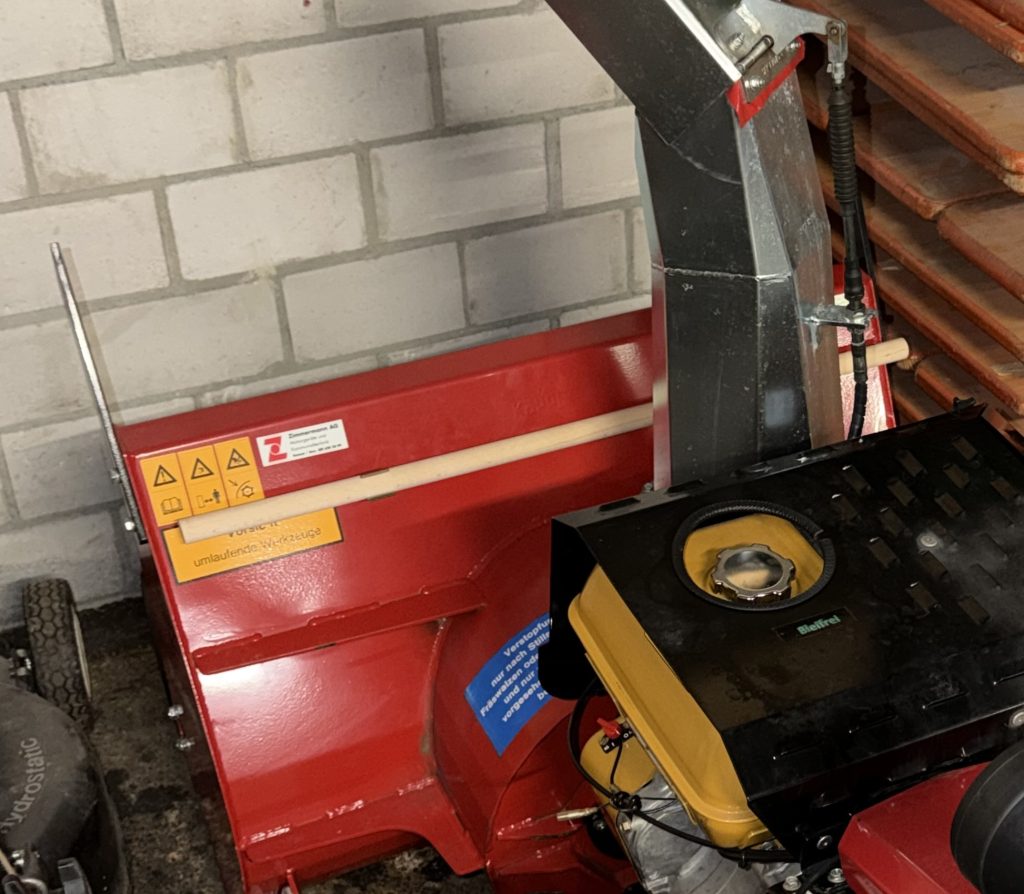 Vorne ist ein Holzstock geklemmt. Dieser dient dazu schweren und vor allem nassen Schnee aus dem Auswurf zu entfernen. Wichtig/bzw. logisch: Fräswerk abschalten.