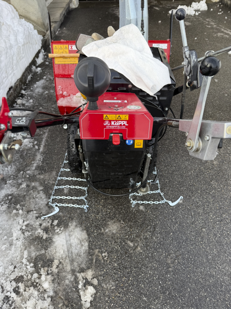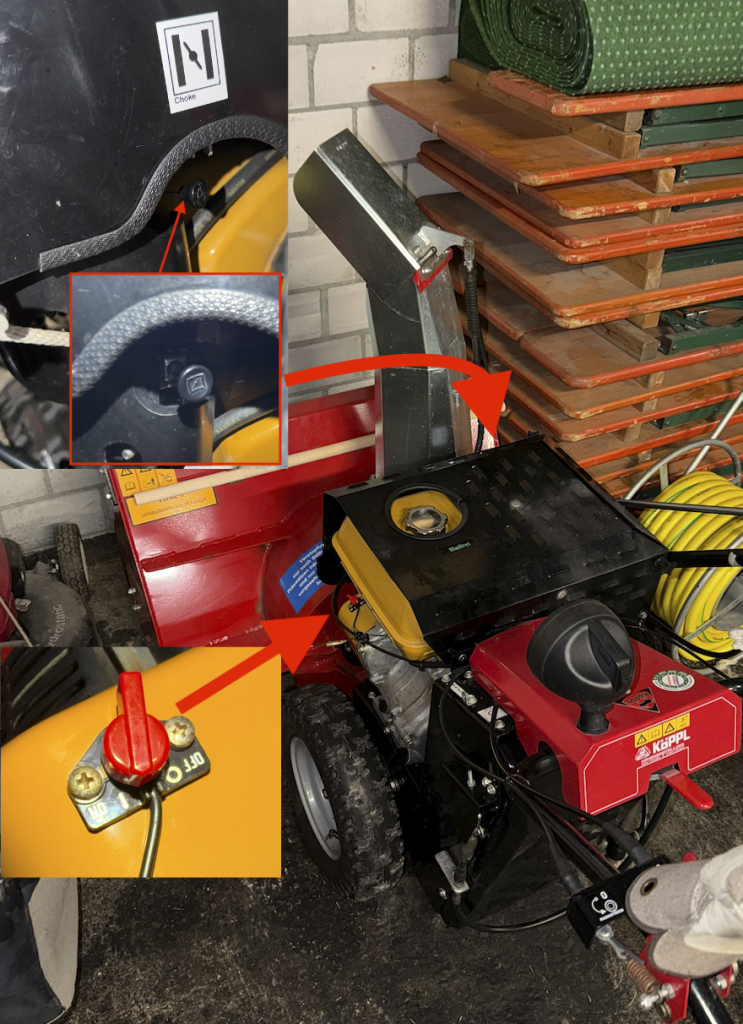 - Vorne beim Scneeauswurf ist der Choke-Knopf. Ohne dass man diesen herauszieht springt der Motor nicht an.