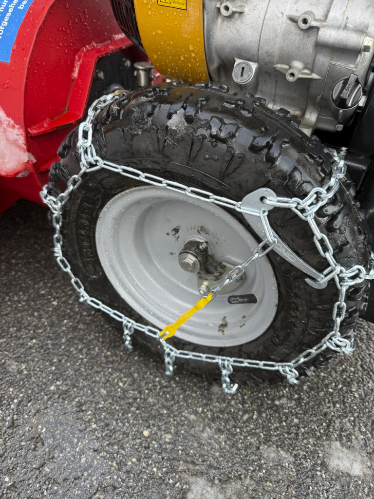 Beim linken Rad befindet sich ein Scherbolzen, der bei zu viel Last abschert/abbricht. Das ist „normal“ bzw. ein Schutz. Dass der Bolzen Weg ist, merkt man dann, wenn das linke Rad frei dreht und die Schneefräse einseitig zieht, weil nur noch das rechte Rad dreht.