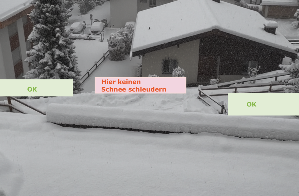 Der Nachbar unterhalb der Liegenschaft wünscht, dass man nicht direkt am Hang vor sein Haus fräst. Daher zu beginn den Schneeauswurf auf die Wiese der Acla richten. Dann Vortrieb wegnehmen und den Schneeauswurf in Richtung Tanne links ausrichten.
